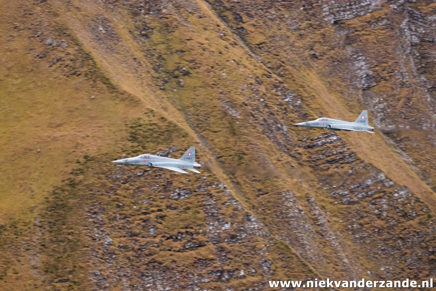 Once the Hornets had finished their part of the fun, it was time for the F-5 Tigers. The shooting from the Tigers was te main reason why I came here, as this was the final time that the F-5s would shoot their cannons at the Axalp Range. The F-5 will finally be withdrawn from service in 2026 (a replacement is currently being sought), but will already be disarmed this year. From then on, the F-5 will only act as an Agressor aircraft and will still perform target towing duties. The F-5 pilots surely wanted to leave in style, as already during the practice runs they showed up from behind the audience and shot their guns at the same moment. Compared with the full afterburners, this scared the hell out of you.
