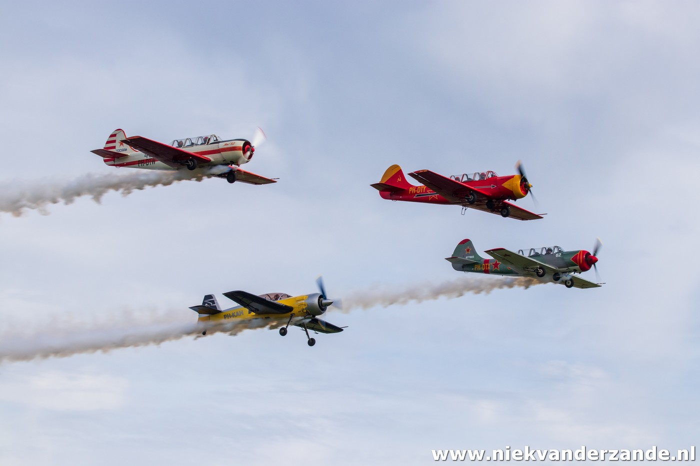 In the afternoon between 13.30 and 15.00, the airshow took place. This show was opened with an 18-person parachute jump, where the parachutists landed in front of the crowdline. Then the flying display started with shows from the Dutch Thunder Yaks, Fokker Four, Pitts Special and a P-51 Mustang.