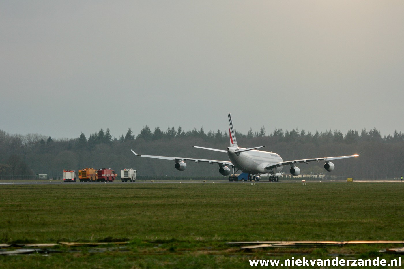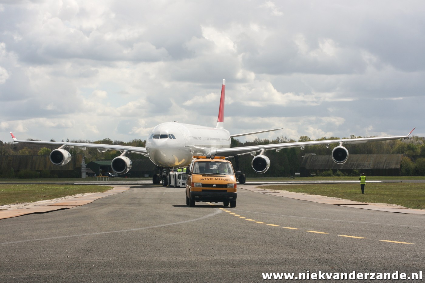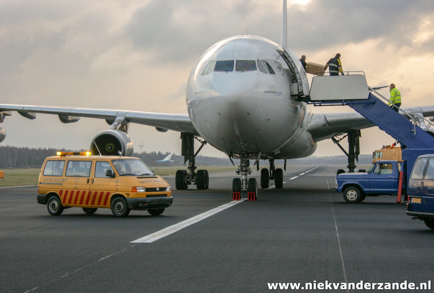 The first aircraft that was scheduled for arrival was Air France’s A.340-311 F-GLZI, which was due to arrive on the 19th of January. This aircraft was ferried from Paris – Charles de Gaulle to Twente Airport, a flight of approximately an hour. Due to a combination of strong winds and low ceiling, the flight was postponed several times on this day, after which the Airbus finally arrived at quarter to four. At that time, there was no longer a tow truck driver available, so that the aircraft was parked at Twente’s Runway 05 end. This was something that was appreciated by many aviation enthusiasts, but less by the members of the flying club. They could not use the 3km runway that weekend.