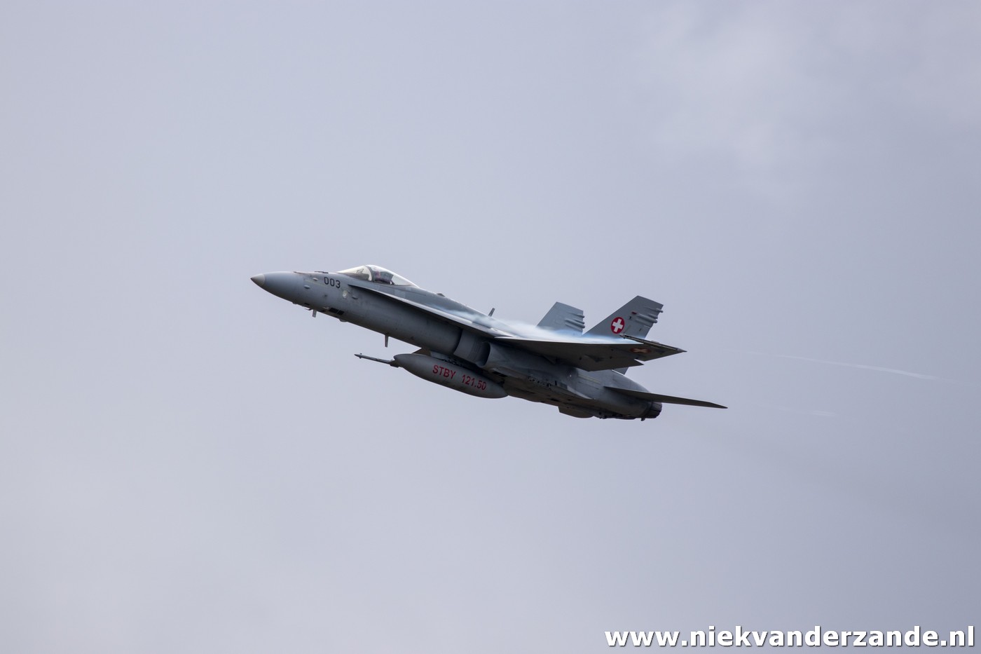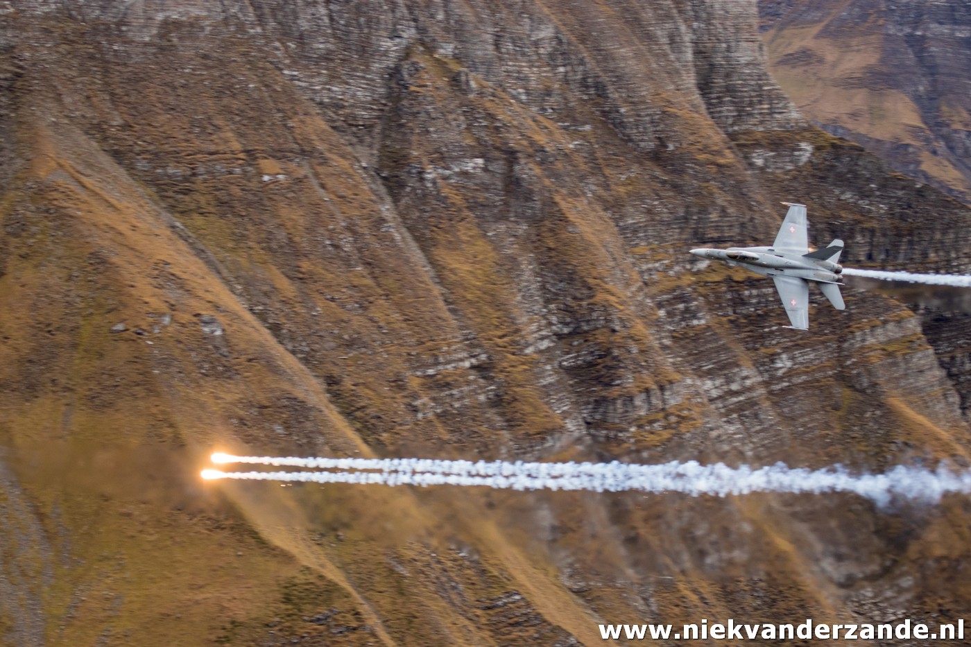 The airshow only takes place in the afternoon, but in the morning there is still plenty to see, as the shooting part is practised by the F-5s and F/A-18s. During these practice runs we got our first taste of what awaited us later that day. It all started with the arrival ofthe Hornets, this formation of four aircraft flew low though the valley, meanwhile dropping flares, to ensure they got our attention.