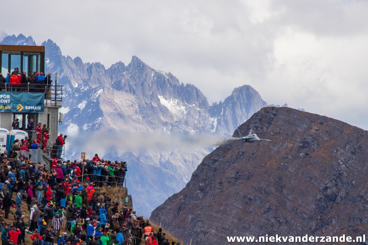 We then waited for the first aircraft to arrive at the Axalp range. The Axalp-Ebenfluh range is a shooting area that was established in 1942. The Swiss Air Force uses this area to practice air-to ground gunnery, during which the Hornets and Tigers shoot their canons on ground targets mounted on the rock face. Every year in October this airshow is organized so that the audinece can also view the shooting exercises. Next to that, other aerial displays are also shown on these days.