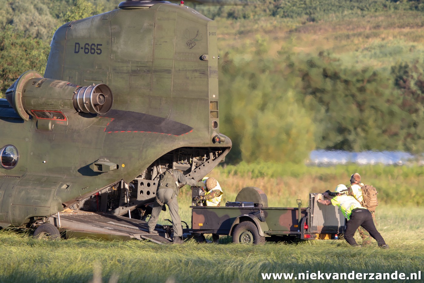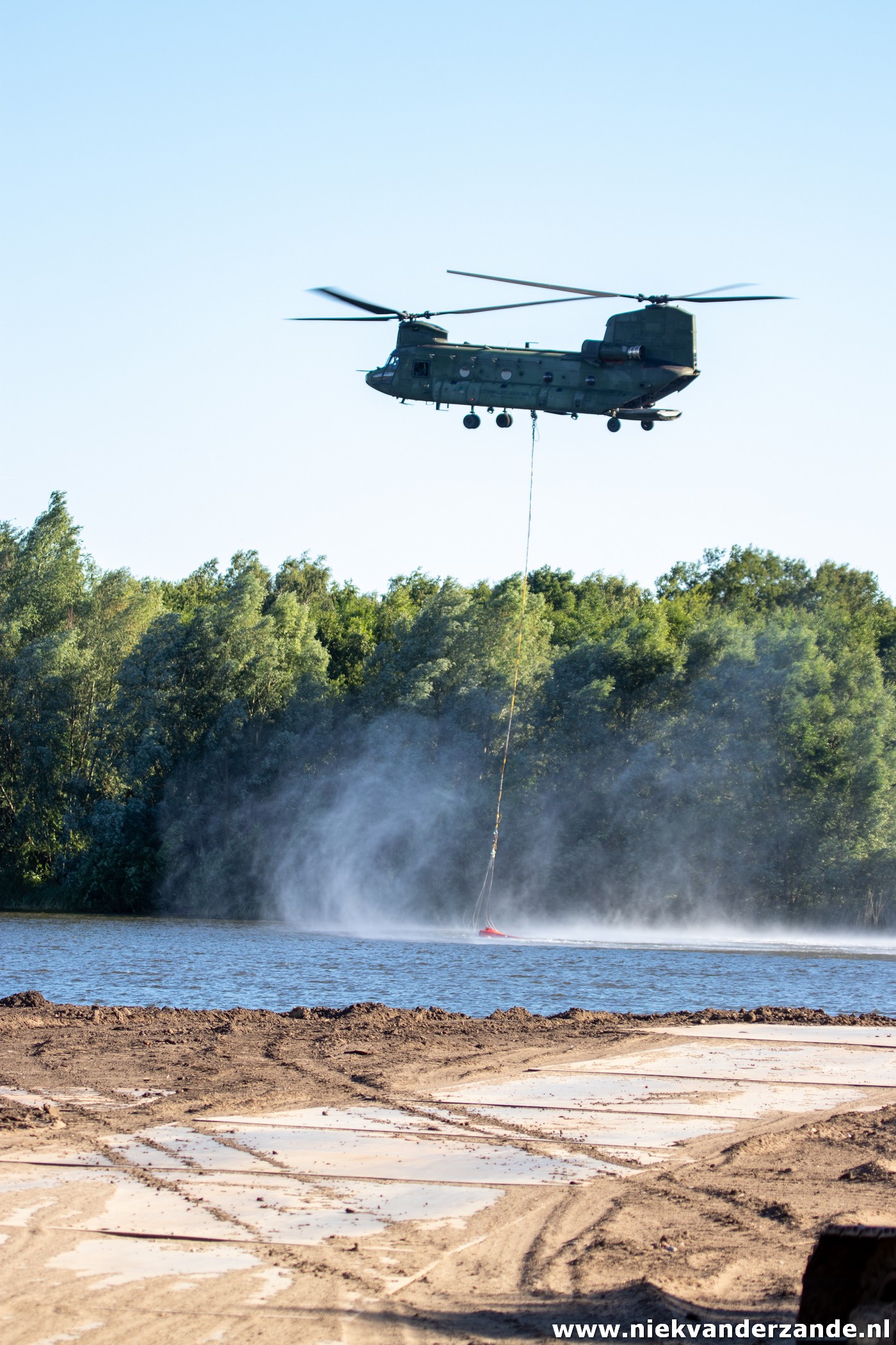 During the next 2 days, Chinooks flew to a quarry next to Boekelo in order to pick up water. The vicinity of this quarry made it possible to perform many runs over the fire. Normally approximately 10 runs could be made before the helicopters had to fly to Deelen Airbase for refuelling. The last drops were made around 20.00, after which the Bambi Bucket was returned to the FBO team and the Chinook returned to Gilze-Rijen airbase.
