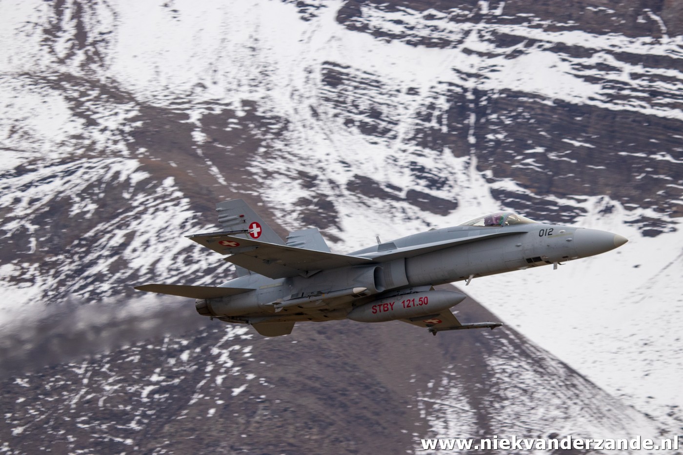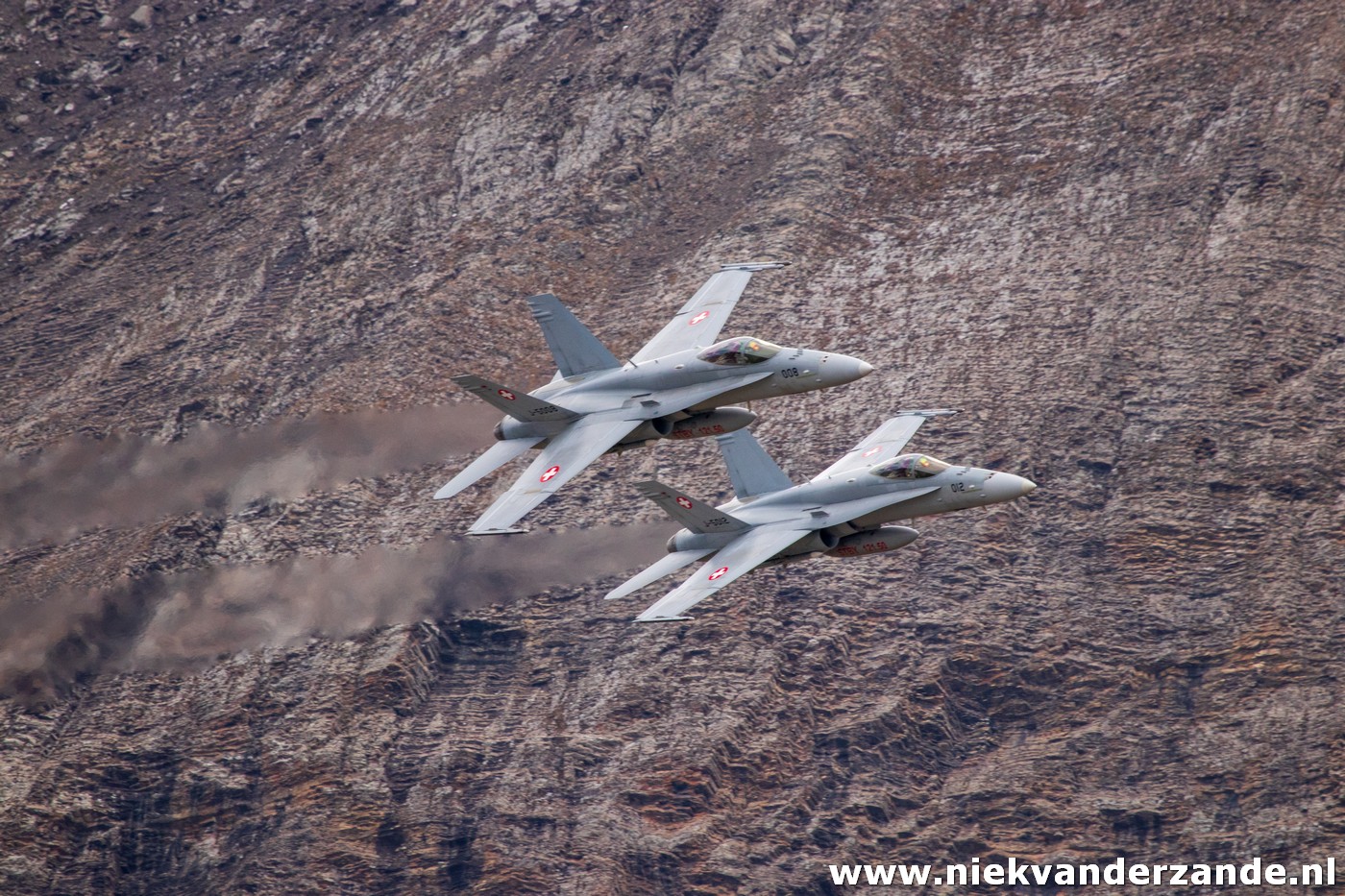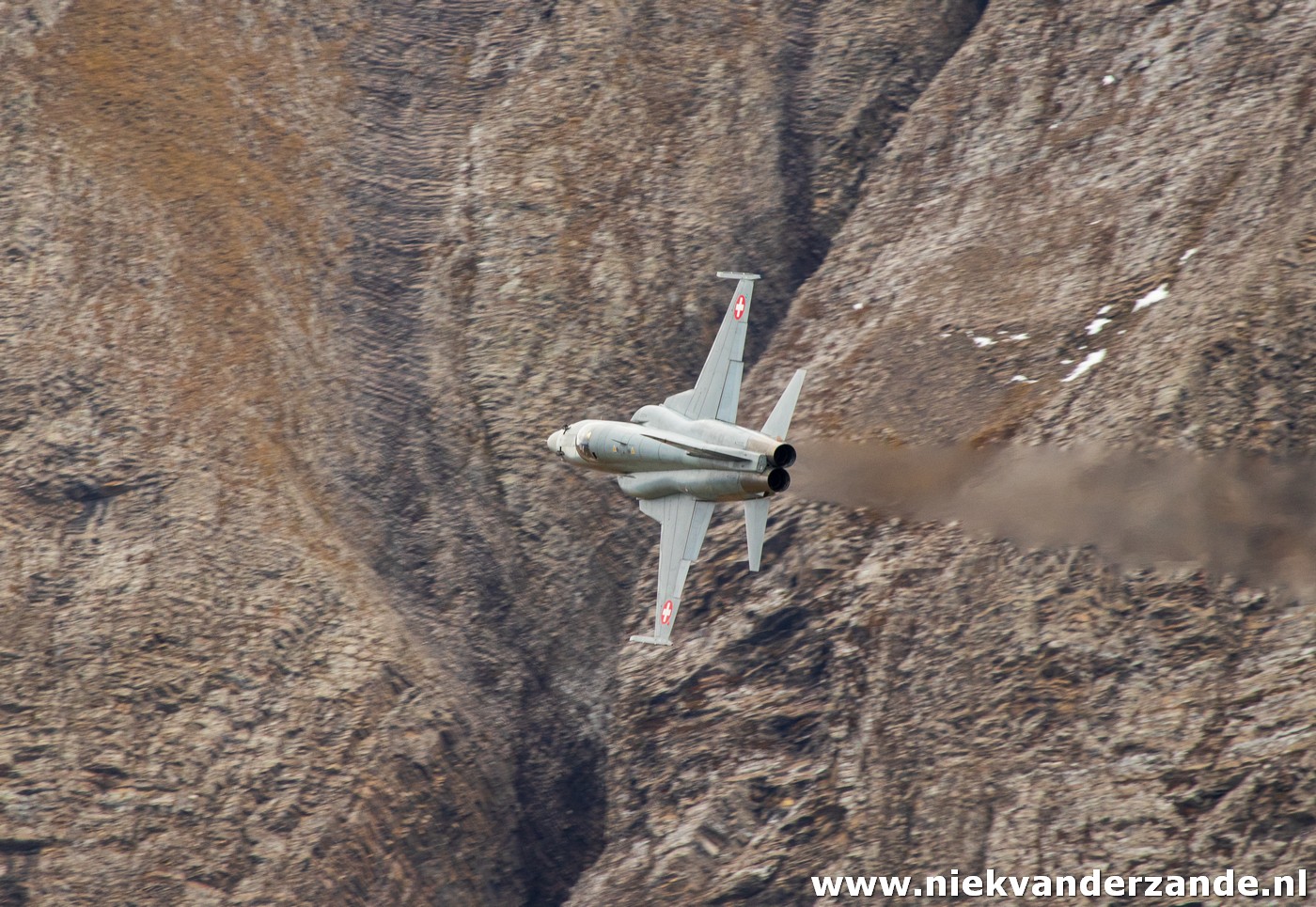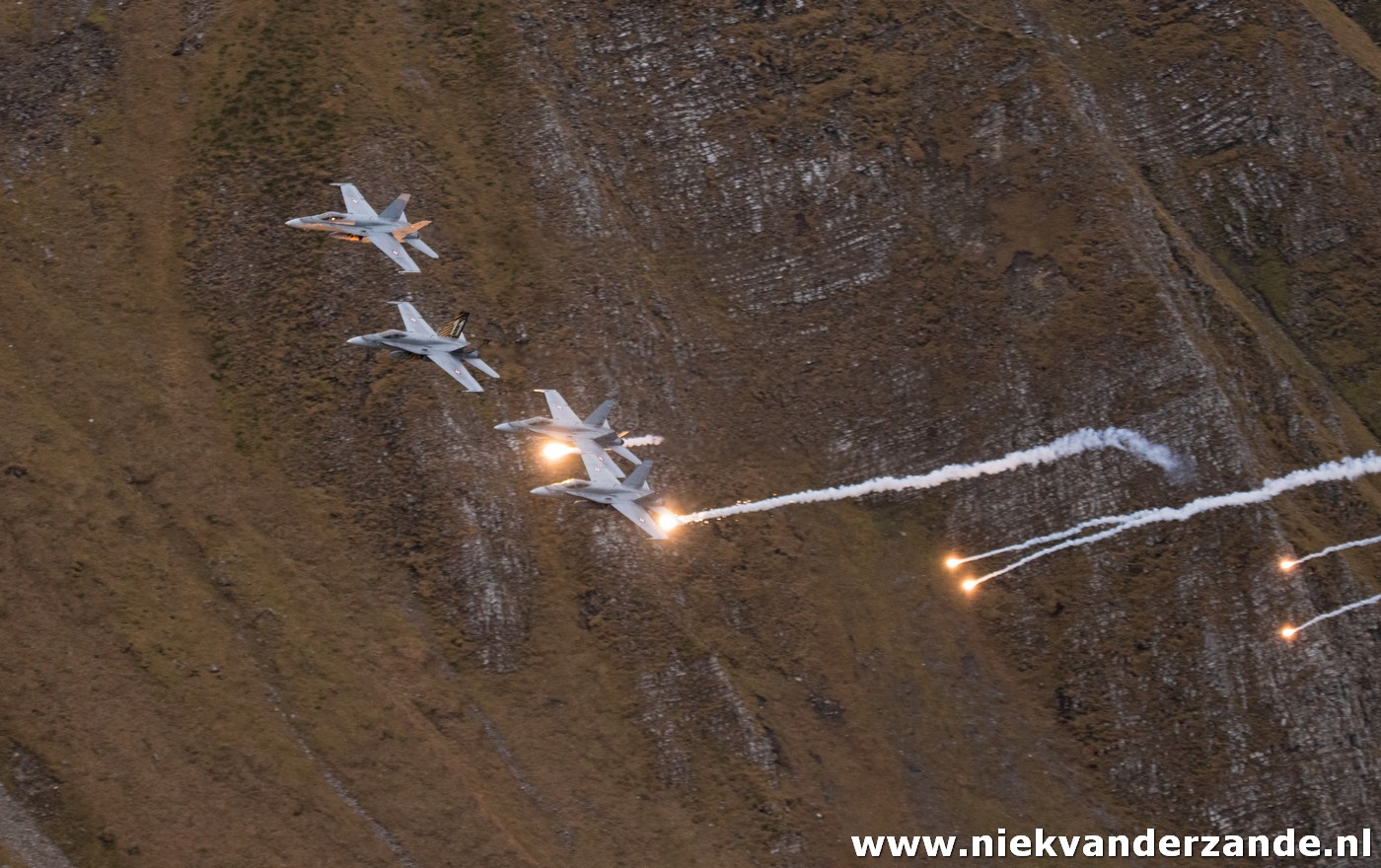The airshow only takes place in the afternoon, but in the morning there is still plenty to see, as the shooting part is practised by the F-5s and F/A-18s. During these practice runs we got our first taste of what awaited us later that day. It all started with the arrival ofthe Hornets, this formation of four aircraft flew low though the valley, meanwhile dropping flares, to ensure they got our attention.