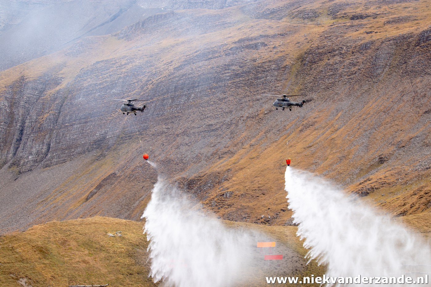 After the Cougar had left, 2 more Cougars approached. Both were carrying Bambi Buckets full of water, to display the fire fighting skills of the Swiss Air Force. Both of them dropped the water right on the target, so this must have been a succesfull mission.