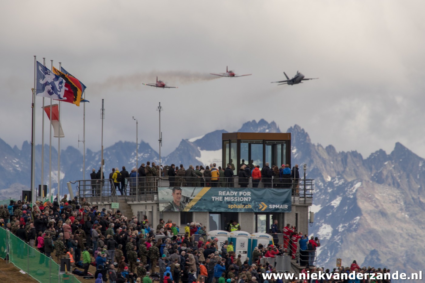 Towards the end of the lunchbreak Cougar helicopters started flying in from nearby Meiringen airbase to drop of the VIP guests, these guests did not have to walk up the mountain and had an easy arrival. At this point also the REGA helicopter and Swiss Air Force rescue helicopters arrived. They were both parked at the mountain in order to be ready to provide assistance for the several thousands of spectators, if need be.