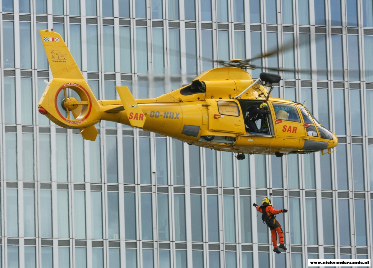 The Search and Rescue Dauphin flies between Rotterdam’s high-rise buildings