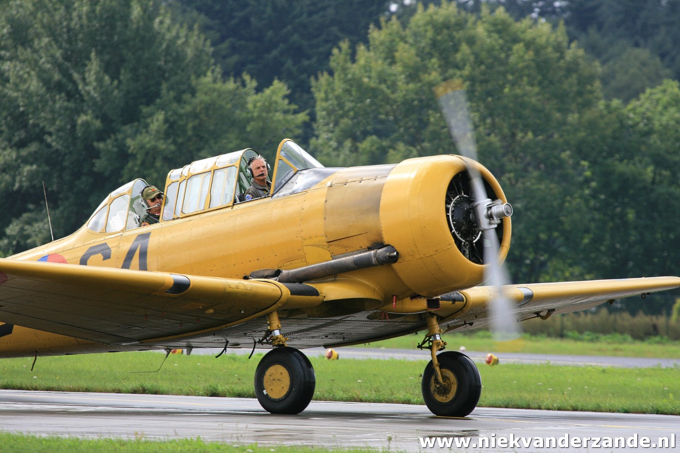 When the 9th of September arrived, Twente woke up to a grey sky with low clouds and lots of rain. This is not the ideal scenario to fly historical aircraft and soon news came through that several participants had to cancel due to this weather. However, towards the end of the morning the meteorological conditions improved and soon the first participants, in the form of two KLu Historical Flight Harvards appeared over Twente’s runway. The aircraft were carefully marshalled onto the airfield and then pushed into the shelter area, where guests could see them up close.
