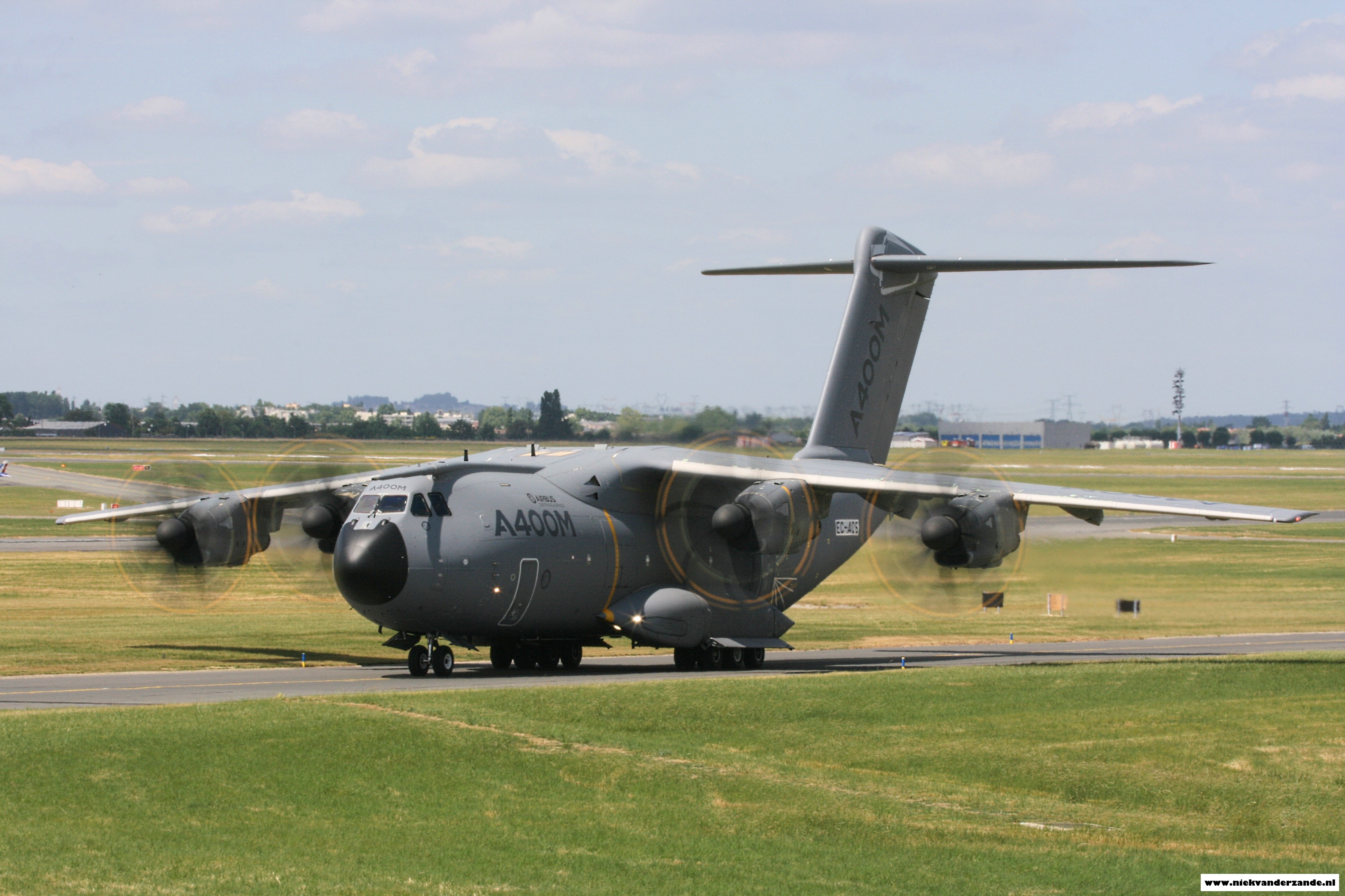 The Airbus A.400M waits at the beginning of the runway whilst the A.380 completes its display.