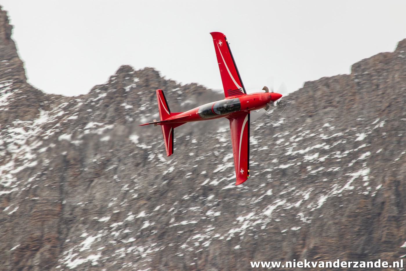 As this was the final F-5 round at Axalp, the organisation had arranged something special to close this era. The six F-5s that had been shooting at Axalp joined up with the six Patrouille Suisse F-5s and toghether this formation of 12 Tigers flew across Axalp. The Patrouille Suisse then continued to show their complete show, which is rather spectacular in this mountain environment.