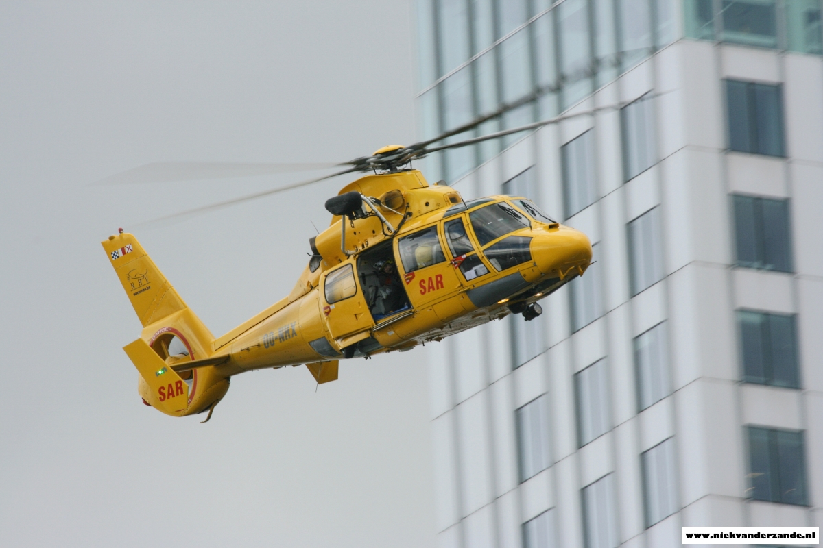 The Search and Rescue Dauphin flies between Rotterdam’s high-rise buildings