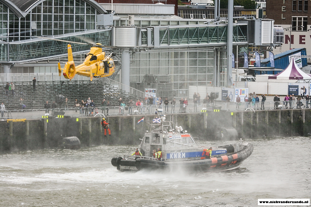 After the first of many rain showers, a rescue operation was displayed. In this scenario a fire had started aboard a tanker vessel, causing injuries to the crew. This meant that assistance was needed to extinghuish the fire and to evacuate the wounded. First on the scene was the KNRM Jeanine Parqui lifeboat, normally based in Hoek van Holland. This lifeboat was followed by one of the Port Authority’s tugs, which used its massive watercanons to stop the fire. Finally a Noordzee Helikopters Vlaanderen (NHV) SA.365 Dauphin helicopter arrived to rescue the people from the burning tanker. NHV performs Pilot and SAR duties on behalf of the Dutch government from their heliport in the Pistoolhaven on the Maasvlakte.